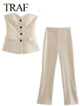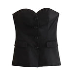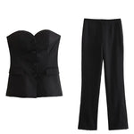 De mouwloze off-shoulder top met knopen combineert perfect met de eenvoudige rechte broek voor een chique, moderne look. Ideaal voor zowel zakelijke als feestelijke gelegenheden!